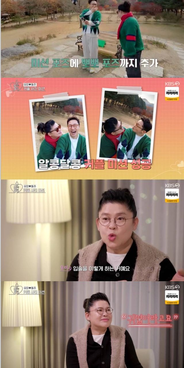 이후 커플 포즈 미션이 주어졌고 이영자는 황동주에게 백허그를 했다. 이때 이영자는 황동주에게 "왜 이렇게 떠냐"라며 "배를 떠는 건 처음봤다"고 말했다. 사진을 찍으며 황동주는 이영자를 쳐다보며 입술을 내밀었다. 뽀뽀 포즈를 취한 이들은 달달한 분위기를 풍겼다.