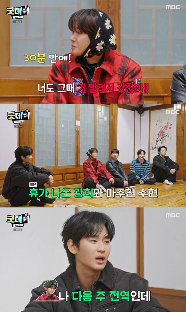 황광희는 김수현에게 "너 그때 (나한테) 기 빨려서 갔잖아. 30분 만에"라며 이야기를 꺼냈다. 김수현은 "그건 군인에게 피 같은 시간이지 않냐. 빨리 빨리 움직여야지"라고 말했다.