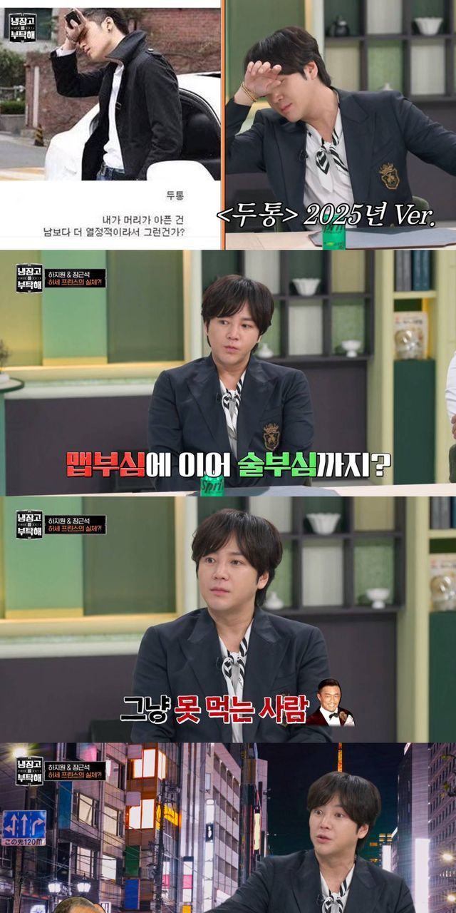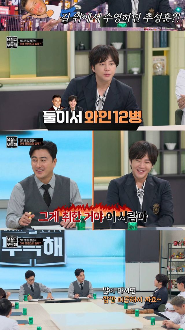 이어 "많이 마시면 잠깐 피곤해서 잔다"고 했고, 안정환은 "그게 취한 거다"라고 말해 웃음을 자아냈다. 장근석은 "예전에 추성훈 씨하고 와인 12병 마셨다"고 전해 놀라움을 안겼다. 하지원 또한 "와"라며 놀란 모습을 보였다.