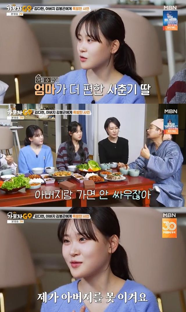 이에 김봉곤은 "너 어머니랑도 상당히 티격태격하던데. 아버지랑은 안 싸우지 않냐. 그런데 어머니가 좋냐"고 물었다. 김다현은 "아버지랑 안 싸우는 이유가 제가 못 이겨서"라고 답해 웃음을 터뜨렸다.