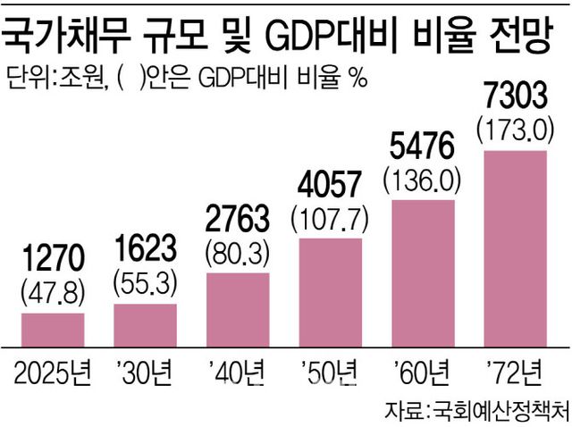 국가채무는 2025년 1270조 4000억원에서 2072년 7303조 6000억원으로 6배가량 폭증할 전망이다. 연평균 증가율은 3.8%다.