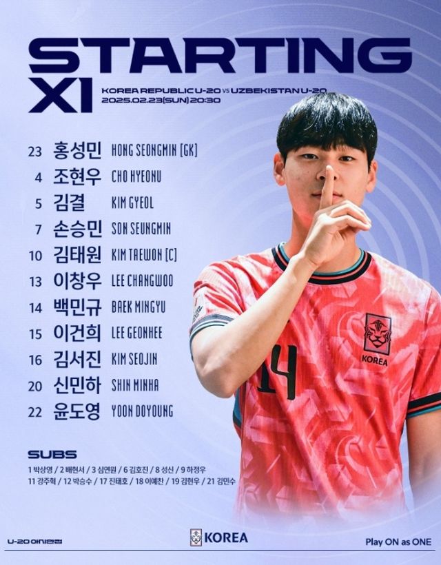 한국은 홍성민이 골키퍼 장갑을 착용했고, 조현우, 김결, 손승민, 김태원, 이창우, 백민규, 이건희, 김서진, 신민하, 윤도영으로 선발 명단을 구성했다.