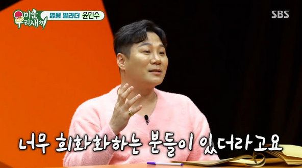 한편, 이날 스페셜 MC로 출연한 윤민수는 “모창하는 사람들을 다 없애 버리고 싶다는 게 사실이냐”라는 MC 서장훈의 질문에 “모창해주시는 건 감사한데 너무 과하게 희화화 시키는 분들이 있더라”고 대답했다. 그는 자료화면에 나온 양세찬을 보고 “특히 쟤! 쟤”라며 격한 반응을 보여 폭소를 자아냈다.