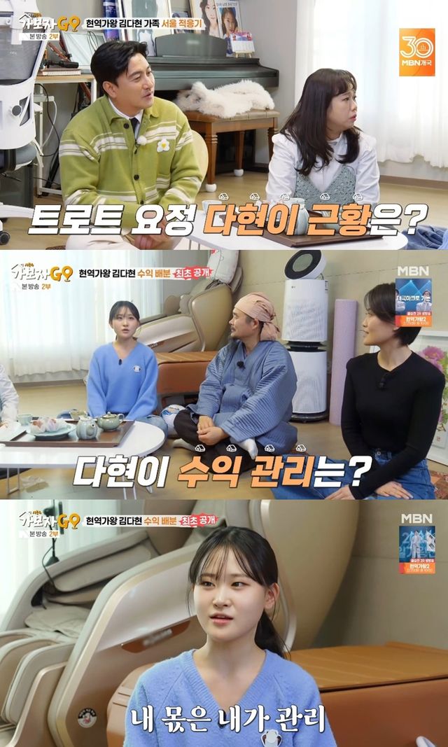 이어 MC들은 부모님과 함께 일하는 김다현에게 “수익 관리는 누가 하는가?”라고 물었고, 김다현은 “내 몫은 내가 관리한다.”라고 똑 부러지게 답했다. MC들은 “가족이라도 금전적인 문제는 굉장히 민감하다”라고 걱정했지만, 김다현의 엄마는 “다현이가 굉장히 철저하고, 자신의 수익을 확실히 챙긴다”라고 답했다.