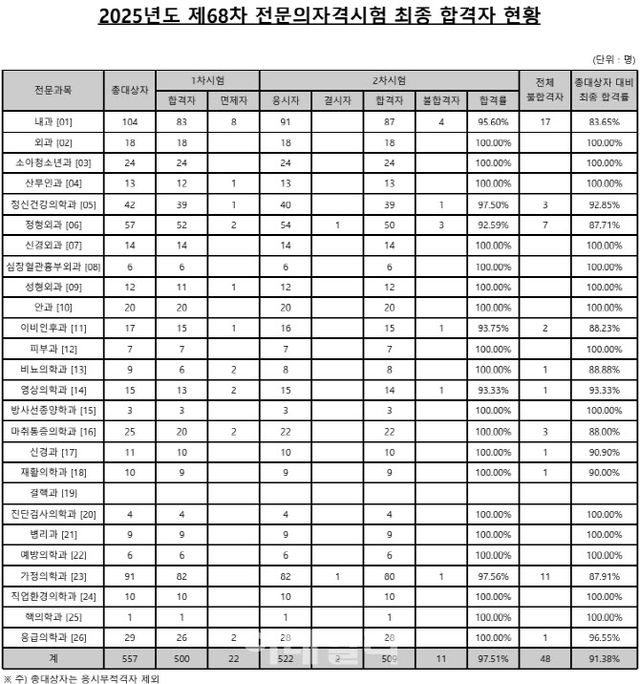 대한의학회는 2025년도 제68차 전문의 자격시험에 522명이 응시해 509명이 최종 합격했다고 24일 밝혔다. 합격률 97.51%를 기록했으며 총대상자 대비 최종 합격률(1차+2차시험)은 91.38%였다.