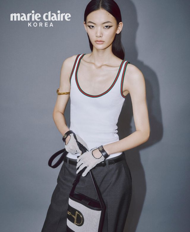 웹 스트라이프 디테일 탱크톱, 그레이 로웨이스트 팬츠, 뱀부 모티프 골드 브레이슬릿, 아이보리와 블랙 배색의 레더 글러브, 블랙 벨트, 홀스빗 디테일 스몰 버킷 백 모두