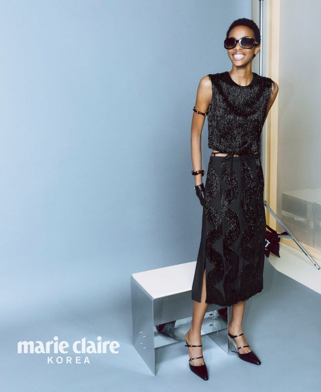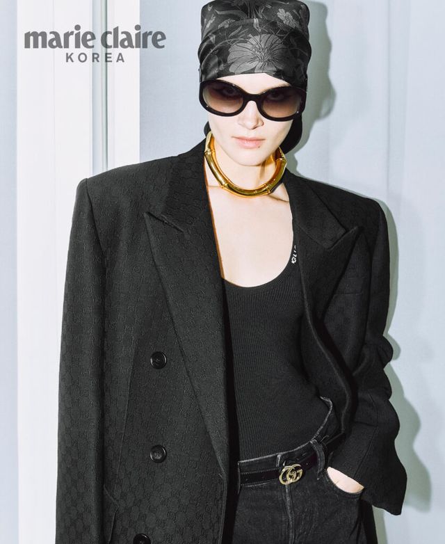 Karolina 블랙 더블브레스트 오버사이즈 코트, 탱크톱, 코튼 데님 팬츠, 두건으로 연출한 블랙 플라워 프린트 실크 스카프, 오버사이즈 선글라스, 뱀부 모티프 골드 네크리스, 플랫 부츠 모두 Gucci.