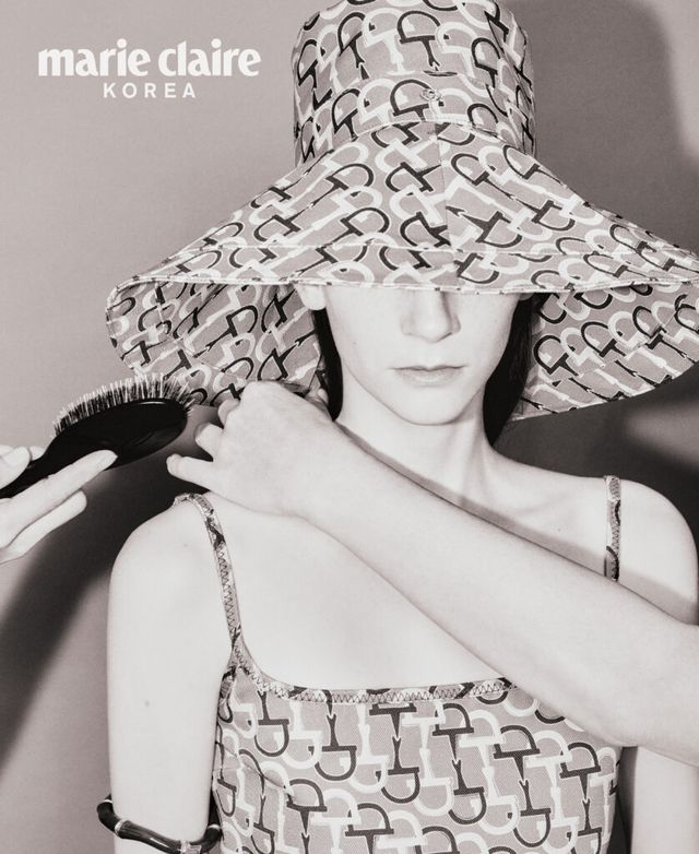 Emese 홀스빗 프린트의 스파게티 스트랩 톱과 미니스커트, 챙이 넓은 햇.
