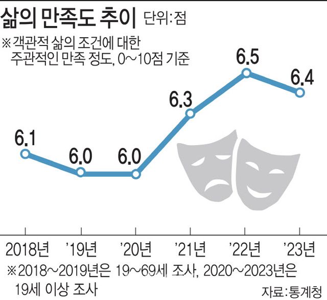 한국인의 삶의 만족도는 2013년 5.7점에서 2017년 6.0점으로 증가한 이후 비슷한 수치를 유지하다가 2022년 6.5점을 찍고, 2023년 6.4점으로 소폭 감소했다. 삶의 만족도는 객관적 삶의 조건에 대한 개인들의 주관적인 만족 정도를 보여주는 지표로 0∼10점으로 측정한다.