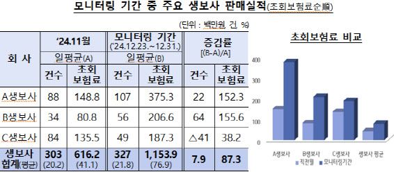 이 기간 하루 평균 계약체결 건수는 327건으로 전 달(303건) 대비 소폭 상승(7.9%)했으나 하루평균 초회보험료는 11억 5390만원으로 전달(6억 1620만원)보다 87.3% 상승했다. 금감원은 “고액 건 위주로 판매가 확대한 것으로 분석했다”고 설명했다.