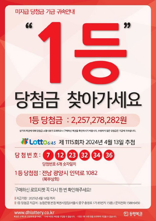 24일 복권수탁업자 동행복권은 “지난해 4월 13일 추첨한 로또복권 1115회차 1등과 2등 미수령 당첨금 지급 기한이 약 한 달 앞으로 다가왔다”고 밝혔다.