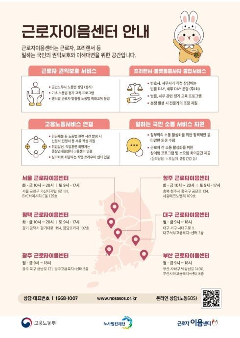 [와이뉴스] 고용노동부 노사발전재단은 올해부터 '근로자이음센터'에서 근로자의 권익보호와 이해대변을 넘어 프리랜서·플랫폼종사자 등으로 서비스 대상을 확대한다고 밝혔다.
