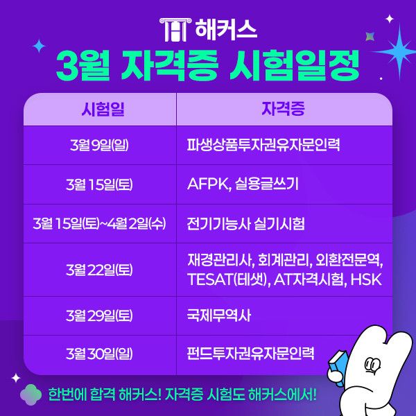 어학, 유학 시험 강의부터 취업, 편입, 자격증, 전문 자격증까지 다양한 교육 콘텐츠를 제공하는 해커스 교육그룹이 2025년 3월에 치러지는 자격증 시험일정 정보를 공개했다.