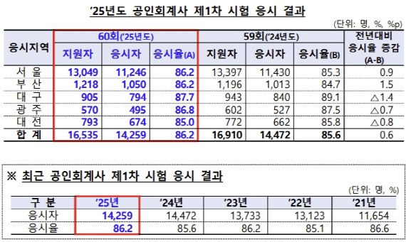 24일 금융감독원에 따르면 지난 23일 전국 29개 시험장에서 치러진 제60회 공인회계사 제1차 시험의 응시자는 총 1만 4259명으로 전년(1만 4472명) 대비 1.5% 감소했다. 응시율은 0.6%포인트(p) 상승한 86.2%로 잠정 집계됐다.