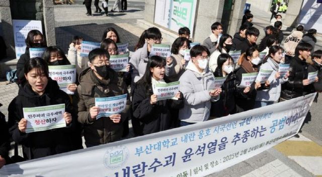 현장에 참여한 재학생 30여명은 “내란 수괴 옹호하는 시국선언 웬 말이냐”, “민주파괴 극우세력 청산하자” “부마 정신 계승하여 윤석열을 끝장내자” 등의 구호를 외쳤다.