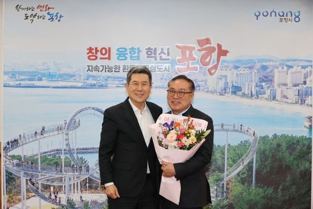 | ▲ (좌)이강덕 포항시장, (우)한상호 제11대 포항시사회복지사협회장 |