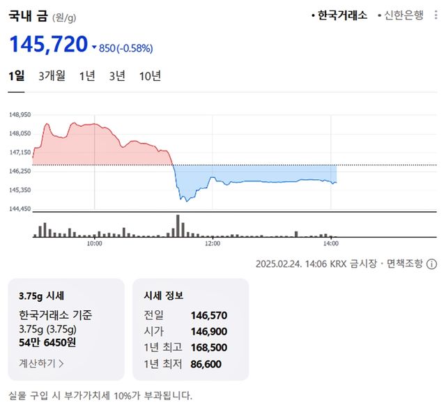 국내 금시세(금값)가 24일 오후 하락세(전 거래일 대비)를 보이고 있다.