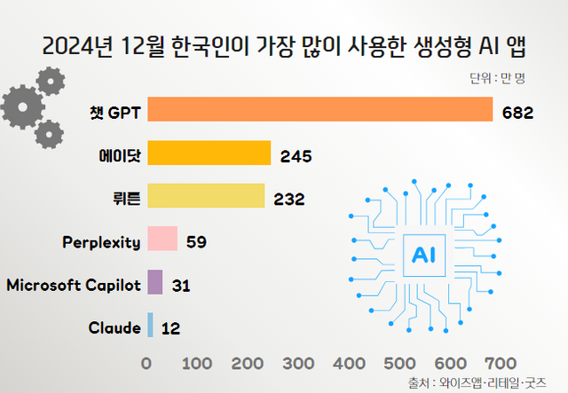 국내에서도 챗GPT 사용률은 꾸준히 증가하고 있다. 지난 1월, 데이터 분석업체 와이즈앱·리테일·굿즈가 발표한 자료에 따르면, 지난해 12월 기준으로 가장 많이 사용된 생성형 AI는 챗GPT로, 단 한 달 동안 약 682만 명이 이용한 것으로 조사됐다. 챗GPT에 이어 에이닷, 뤼튼, 퍼플렉시티, 마이크로소프트 코파일럿, 클로드 등의 AI 서비스가 뒤를 이었다.