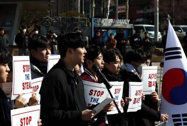 24일 숭실대 구성원 모임 ‘자유민주주의를 수호하는 숭실인들’ 소속 학생 10여 명은 이날 오후 2시 서울 동작구 숭실대 정문에서 시국선언을 진행했다.