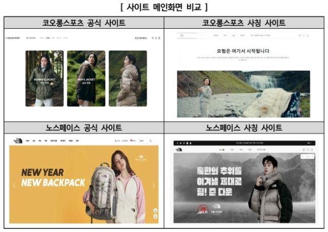 아웃도어 브랜드 공식 홈페이지와 사칭 사이트 메인화면 비교. ⓒ 한국소비자원