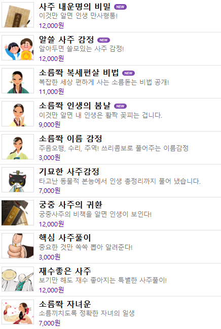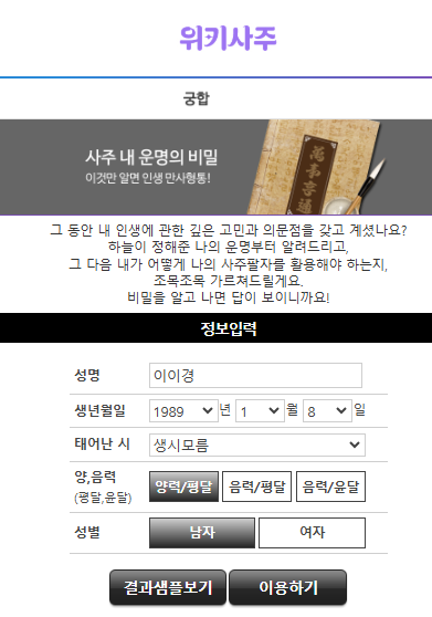온라인 사주 전문 사이트 '위키사주'는 오랜 전통을 바탕으로 한 사주팔자와 현대적인 분석 기술을 결합하여 각자의 운명을 상세히 분석한다. 이름과 생년월일, 태어난 시간과 성별을 입력하면 간단하게 이용할 수 있다. 만사형통 내 운명의 비밀 사주, 쓸모있는 사주 감정, 복잡한 세상 편하게 사는 소름돋는 비법 사주까지 다양한 운세를 재미있게 점칠 수 있다.