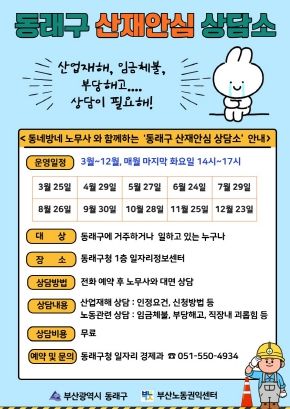 ‘동래구 산재안심 상담소’는 부산노동권익센터와 연계하여 운영되며, 매월 마지막 화요일 오후 2시부터 5시까지 동래구청 1층 일자리정보센터에서 진행된다. 공인 노무사가 사전 예약자뿐만 아니라 상담일 현장 방문자에게도 무료 상담을 제공한다.