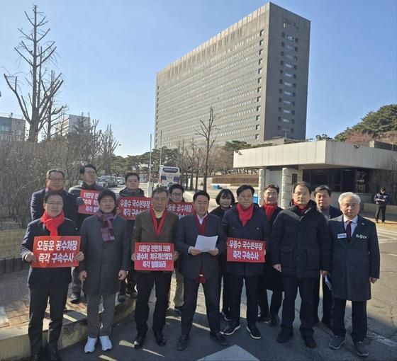 국민의힘 탄핵반대 당협위원장 모임(탄반모)이 24일 서울 서초구 서울중앙지검 청사 앞에서 오동운 공수처장을 내란 혐의로 즉각 입건해 구속 수사하라고 촉구하는 성명을 발표했다. / 탄반모 제공