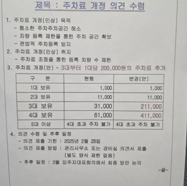 안내문을 보면 아파트 측은 협소한 주차 공간을 해소하고 차량 등록 제함을 통한 주차 공간 확보, 편법적 주차 등록 방지를 위해 주차료를 인상한다는 내용이 담겨 있다.