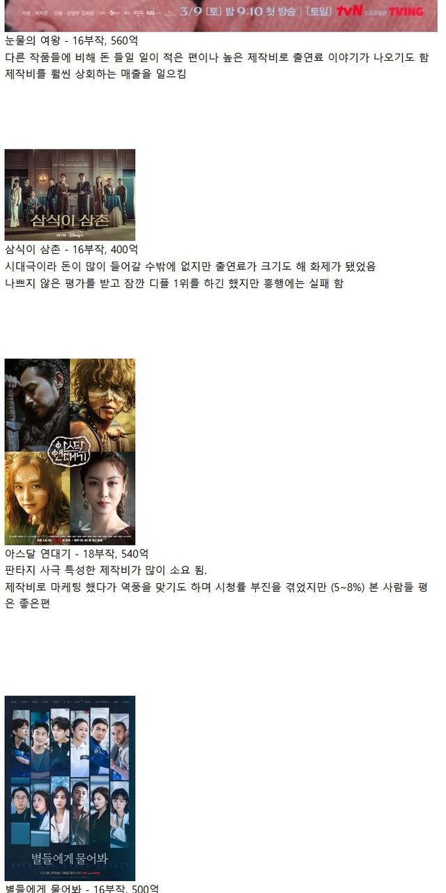 400억 넘는 제작비의 드라마들
