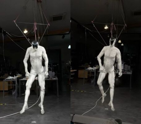 공개된 영상에서는 남성의 신체와 똑 닮은 약 180cm 키의 로봇이 천장에 매달려 사람처럼 팔다리를 휘젓는 모습이 담겼다.