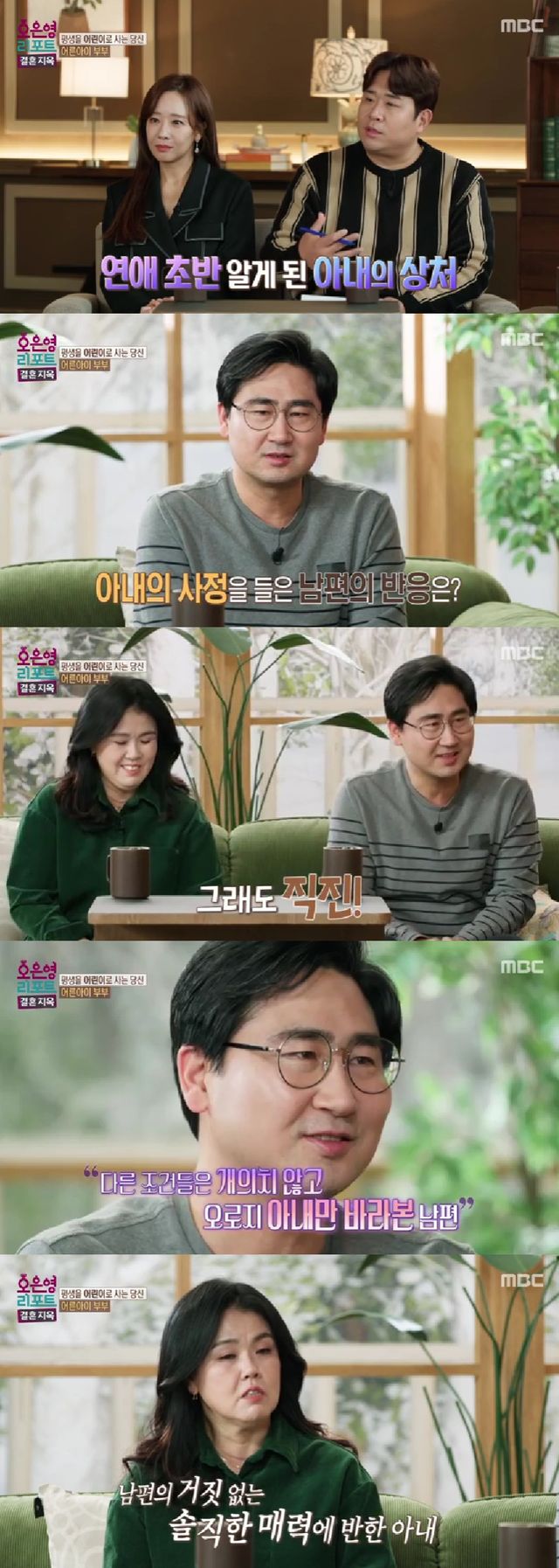 아내는 남편의 매력 포인트에 대해 "이 사람은 이제 거짓이 없다. 모든 것에 대해 오픈하고, 천천히 다가와서 고맙다"며 진실하고 다정했던 남편의 모습을 꼽았다.