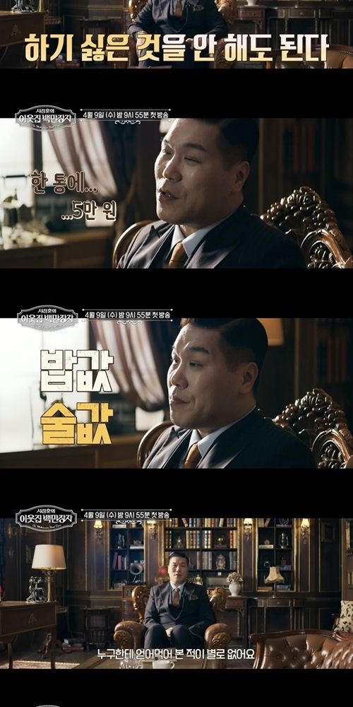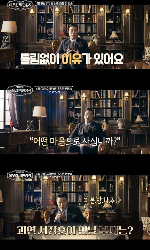 한편 서장훈은 ‘이웃집 백만장자’를 통해 부자들을 만나고 싶은 이유에 대해 “작은 성공이든 큰 성공이든 어떤 성공에도 이유가 있다. 우리가 배울 수 있는 무언가가 있을 것”이라고 설명했다. “어떤 마음으로 사십니까?”라는 심오한 질문을 가지고 떠나는 서장훈의 부자 탐구, 그가 만날 부자의 정체는 ‘이웃집 백만장자’ 방송을 통해 확인할 수 있다.