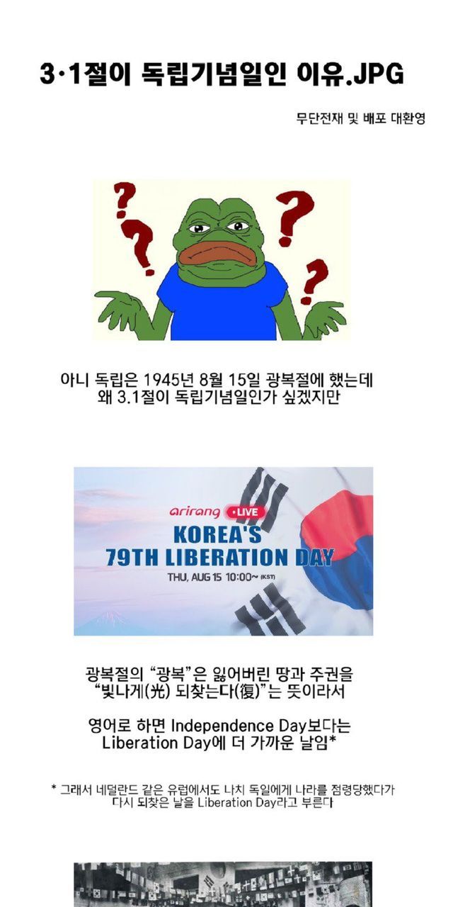 참고로 광복절의 광복은 "주권과 영토를 명예롭게(光) 되찾는다(復)"란 뜻이라 독립과는 다르다고