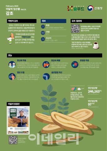 박은식 산림청 산림산업정책국장은 “감초는 천연 감미료, 건강식품, 한방 원료, 기능성 화장품 등 다양한 산업분야에서 주목받고 있다”며 “감초를 비롯한 다양한 우리 임산물이 현대인의 건강 증진에 기여할 수 있도록 효능 연구를 활발히 이어나가겠다”고 말했다.