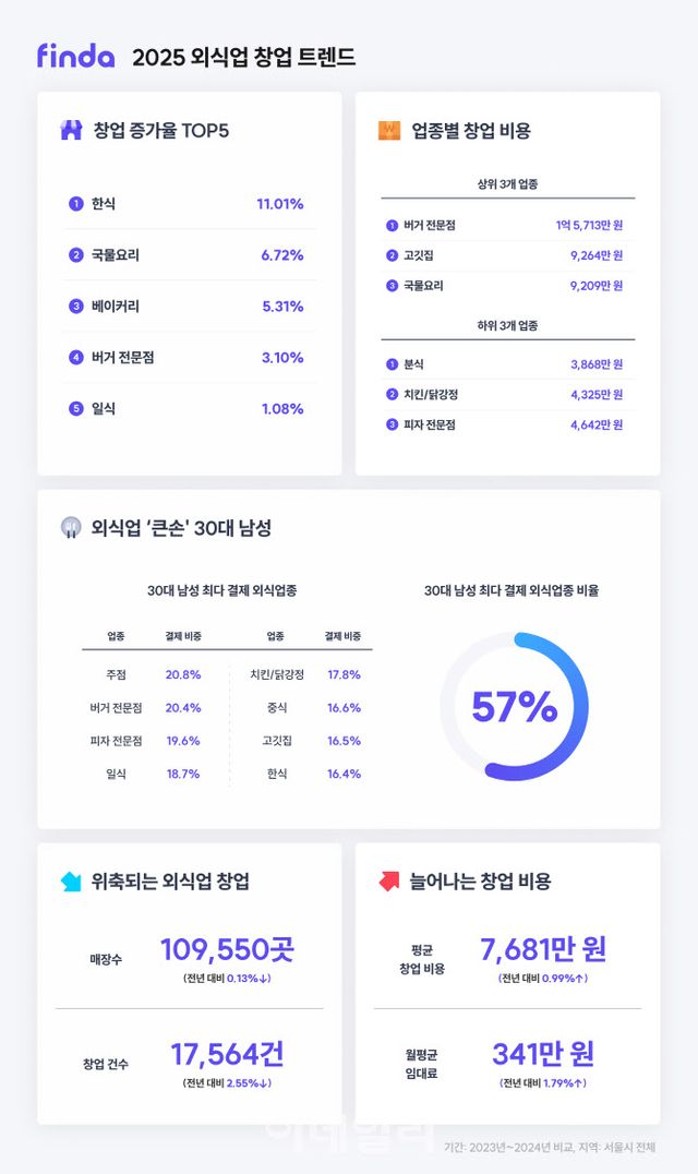핀다는 오픈업의 외식업 창업 계산기를 활용해 외식업 창업에 필요한 비용도 함께 공개했다. 지난해 서울에서 외식업 매장 창업 시 필요한 자금은 평균 약 7681만 원으로 2023년(7606만 원)보다 약 75만 원 증가한 것으로 나타났다. 월평균 임대료도 전년(335만 원) 대비 6만 원 늘어난 평균 341만 원으로 집계됐다.