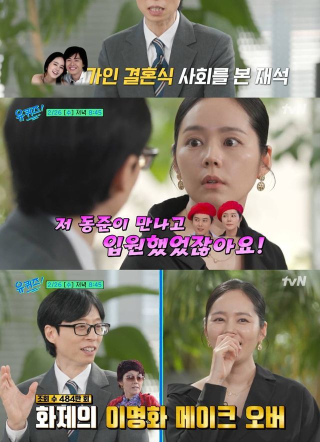 유재석은 "결혼식 사회를 제가 봤었다"라며 인연을 언급했고, 한가인은 "다 깨지고 엉망진창이었다"라고 답했다.