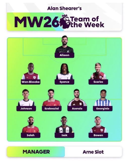 잉글랜드 프리미어리그(EPL) 사무국은 24일(한국시간) 2024~25 EPL 26라운드 베스트11을 선정했다. ‘전설’ 앨런 시어러가 포지션별로 가장 빼어난 활약을 펼친 11명을 뽑았다.