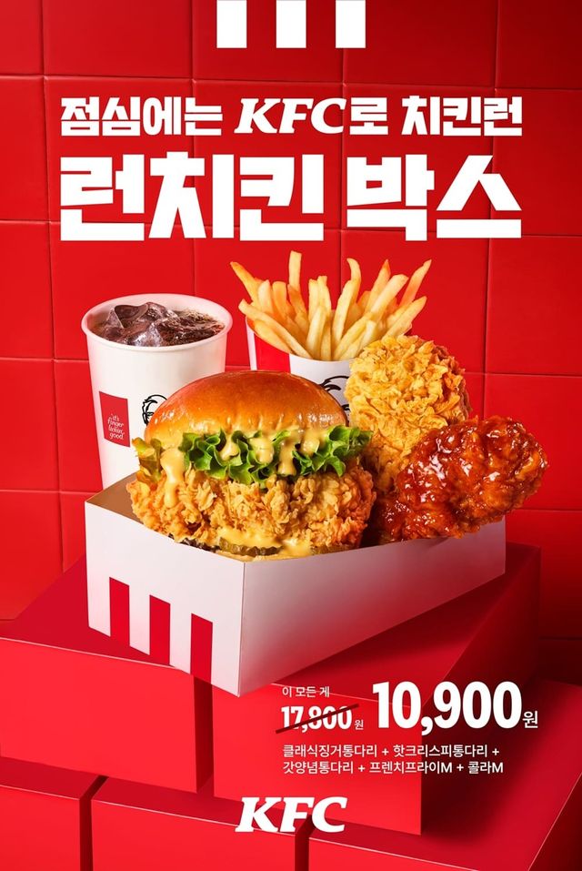 ‘런치킨 박스’는 클래식징거통다리, 핫크리스피통다리, 갓양념통다리, 프렌치프라이M, 콜라M으로 구성된 스페셜 박스 메뉴로, 단품 대비 약 39% 할인된 10,900원에 선보인다. 만 원 초반의 합리적인 가격으로 푸짐한 한 끼를 즐길 수 있어 점심시간대 직장인과 학생들 사이에서 큰 호응을 얻을 것으로 기대된다.