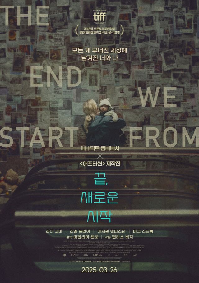 개봉 소식과 함께 공개된 티저 포스터는 아들 ‘젭’을 안고 인형들과 촛불이 놓인 추모 공간 앞에 서 있는 여자의 모습을 담아냈다. 벽이 보이지 않을 만큼 빼곡히 부착된 실종 전단들은 기후 위기 때문에 발생한 유례없는 홍수 피해의 규모를 가늠할 수 없게 하며 엄청난 충격을 줄뿐더러, 누구나 언제든 겪을 수 있는 현실 재난임을 환기해 몰입감을 배가한다. 이와 함께, ‘모든 게 무너진 세상에 남겨진 너와 나’라는 카피는 사랑하는 사람들과 헤어지고 평화로운 삶과 멀어지는 일에 대한 안타까움을 자아내며 가슴을 저릿하게 만든다. 끝으로 ‘베네딕트 컴버배치 X ’애프터썬‘ 제작진’이 프로듀싱에 참여했다는 소식은 탄탄한 작품성은 물론, 세기말적인 상황에서도 자기만의 삶을 향해 다시 걸음을 내딛는 ‘끝, 새로운 시작’ 만의 묵직한 재난 드라마를 기다려 온 예비 관객들의 가슴을 벌써부터 뛰게 한다.