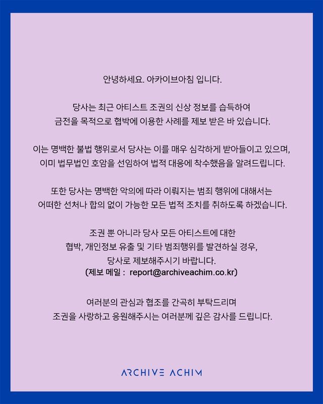 지난 24일 아카이브아침은 공식 SNS 채널 및 공식 홈페이지 등을 통해 하나의 공지를 게재했다. 소속사 측은 "최근 아티스트 조권의 신상 정보를 습득하여 금전을 목적으로 협박에 이용한 사례를 제보 받은 바 있다"라며 "이는 명백한 불법 행위로서 당사는 이를 매우 심각하게 받아들이고 있으며, 이미 법무법인을 선임해 법적 대응에 착수했다"라고 전했다.