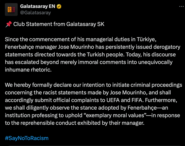 갈라타사라이는 "튀르키예에서 감독 의무를 이행한 이래, 페네르바체 무리뉴 감독은 지속적으로 튀르키예 국민을 향한 경멸적인 발언을 해왔다. 오늘 그의 담론은 단순한 비도덕적 발언을 넘어 명백히 비인도적 수사로 확장됐다"라고 규탄했다.