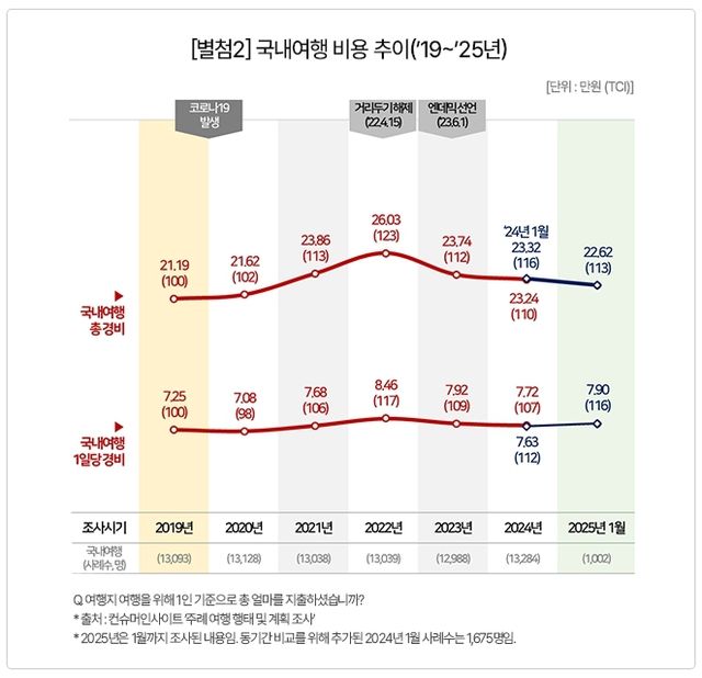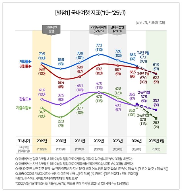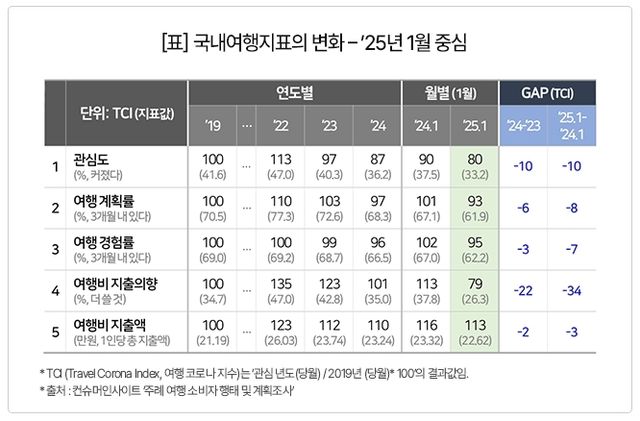 한편, 이번 조사는 여행소비자지표를 코로나19 발생 전인 2019년을 기준으로 설정하고, 2022년 최고점을 기록한 이후 하락세를 분석하는 방식으로 진행됐다.