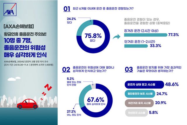 AXA손해보험은 지난해 '2024 운전자 교통 안전 의식 조사'를 통해 졸음운전과 관련한 실제 운전자들의 행태와 인식 및 의견을 점검했다고 25일 밝혔다. ⓒ AXA손해보험