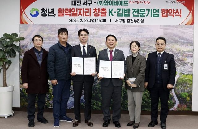 [파이낸셜경제=김예빈 기자] 대전 서구는 김밥 전문기업 (주)와이비에프와 '청년 활력 일자리 창출 K-김밥 전문기업 협약식'을 개최했다고 지난 24일 밝혔다.