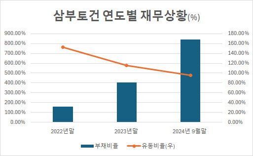 삼부토건의 부채비율은 2023년 말 403.0%에서 작년 9월 말 838.5%로 두 배 이상 높아졌다. 시공능력평가 100위권 건설사 중 부채비율이 가장 높았다. 유동성 상황을 보여주는 유동비율은 95.1%로 100%를 하회했다. 단기부채가 단기 자산보다 많아 기업이 보유한 단기자산만으로 1년 내 갚아야 할 부채를 모두 갚기 어렵다는 것을 의미한다. 특히 삼부토건은 2022년 재무제표와 관련해 외부감사인의 의견불일치를 받았고, 작년 감사보고서가 늦어져 사업보고서 제출 자체가 지연되는 등 외부 감사와 관련된 악재도 있었다.