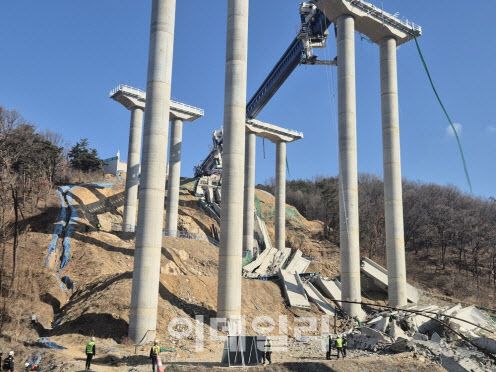 이 공사의 사업비는 2000억원 규모로, 사고가 발생한 현장에서는 ‘DR거더 런칭 가설 공법’이 적용됐다. DR거더(기둥과 기둥을 연결하는 보) 설치 후 장비를 철수하는 과정에서 거더가 떨어지면서 사고가 발생했다.