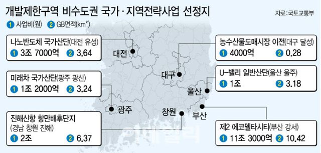 이어 대전권의 나노반도체 국가산단이 3조 6980억원의 사업비가 투입돼 두 번째로 큰 규모다. 이 외 부산권 첨단사이언스파크(3조 3000억원 규모), 창원권 진해신항 항만배후단지(2조 518억원 규모), 부산권 동북아물류플랫폼(1조 5301억원 규모), 광주권 미래차 국가산단(1조 2000억원 규모), 울산권 U-밸리 일반산단(1조 423억원 규모)와 수소융·복합밸리 산단(9709억원) 등의 순으로 선정됐다.