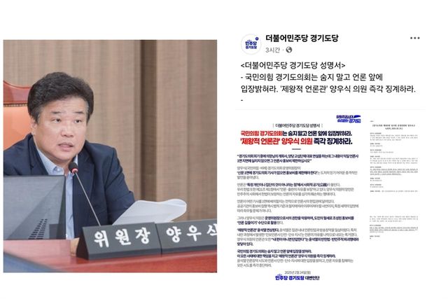 더불어민주당 경기도당은 “언론사의 편집권을 침해하고 도민의 혈세를 언론 길들이기에 활용하려는 행태”라고 주장하며, 양 위원장의 징계를 요구했다.
