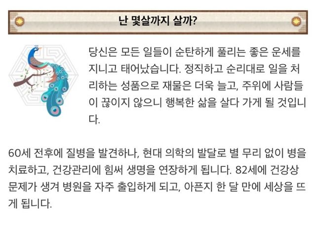 이처럼 자신의 수명을 궁금해하는 이들을 위해 빠르고 간편하게 해답을 제공하는 사이트를 소개하고자 한다. 몇살까지 살 수 있을지 궁금할 때 빠른 해답과 방법으로 속 시원한 고민 해결을 해줄 사이트를 소개하고자 한다. 이는 '위키 사주'로 유저가 이름, 생년월일, 태어난 시간, 성별을 입력하면 각각의 서비스에 따라 자신의 수명운, 건강운, 나에게 좋은 음식과 나쁜음식, 용신까지 알려준다.
