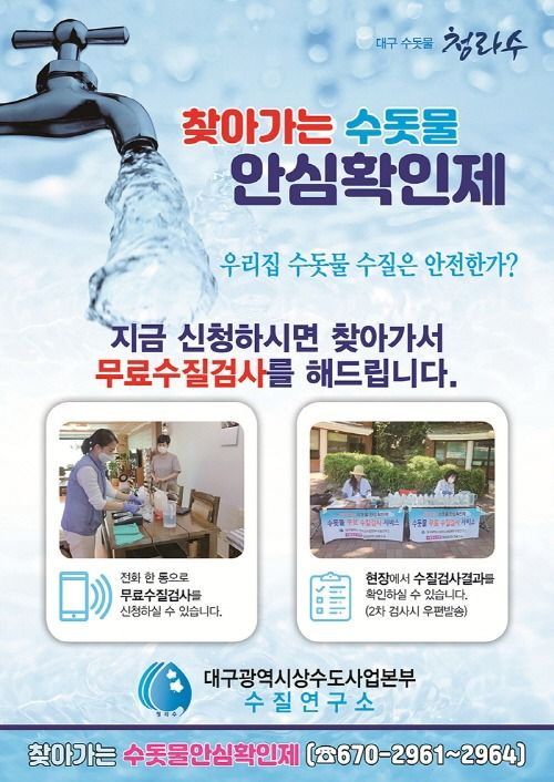 대구광역시 상수도사업본부는 3월 10일(월)부터 11월까지 약 6,500세대를 방문해 무료로 수질검사를 제공하는 ‘찾아가는 수돗물 안심확인제’를 운영한다.